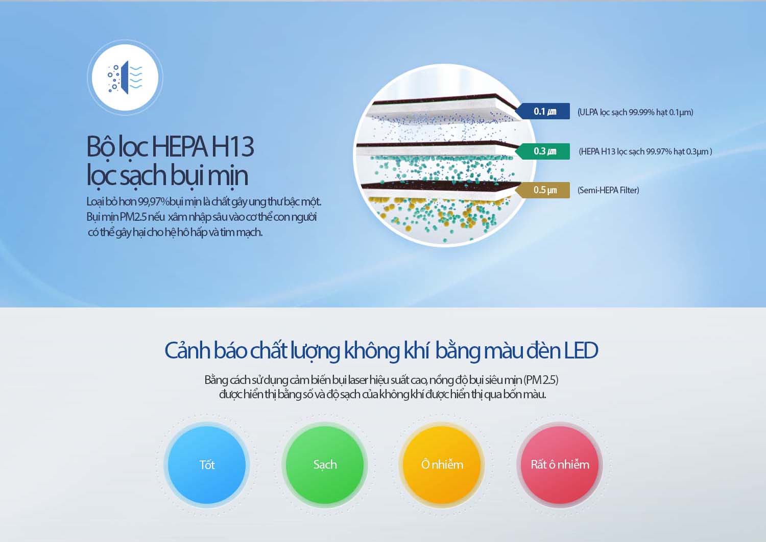 Màng lọc HEPA đạt tiêu chuẩn H13, ở mức cao đối với tiêu chuẩn về màng lọc của máy lọc không khí. Tiêu chuẩn này được xác định bởi Bộ năng lượng Hoa Kỳ (DOE) và trong liên minh Châu Âu là Tiêu chuẩn Châu Âu EN 1822:2009.