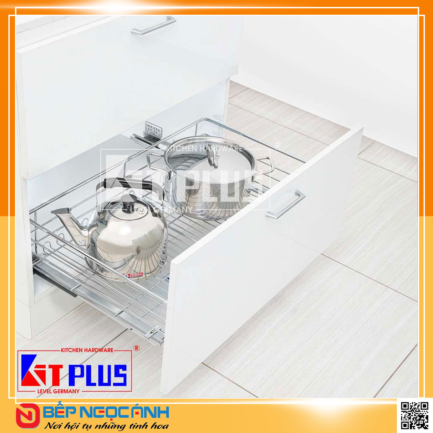Ưu điểm của sản phẩm: Giá xoong nồi nan tròn Inox mờ, ray giảm chấn Kit Plus DG70S