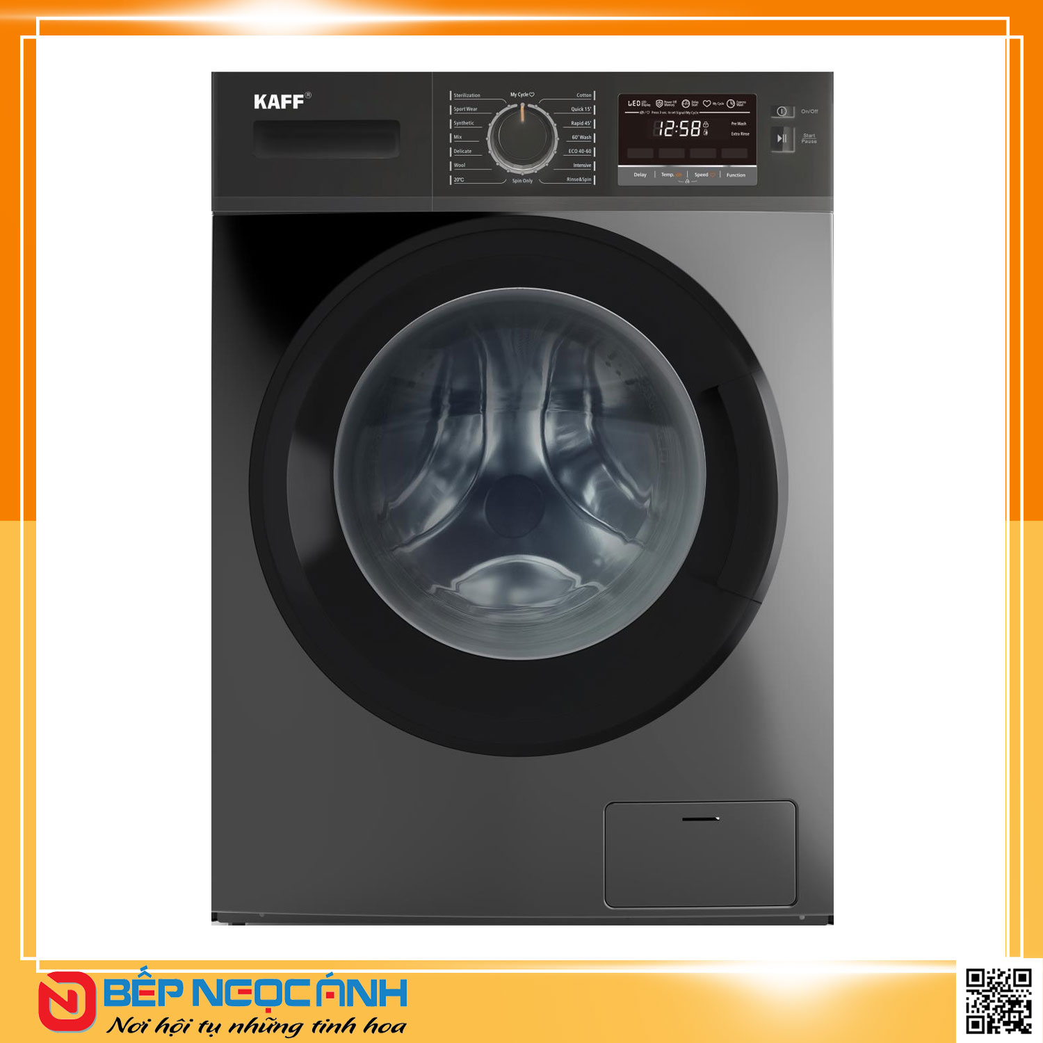 – 16 chương trình giặt sấy tự động tích hợp (Intensive, Quick 15′, Rapid 45′, ECO 40-60, Wool, 60′ Wash, Sterilization, Spin Only, Cotton, Synthetic, Mix, 20°C, Delicate, Sport Wear, My Cycle, Rinse & Spin)