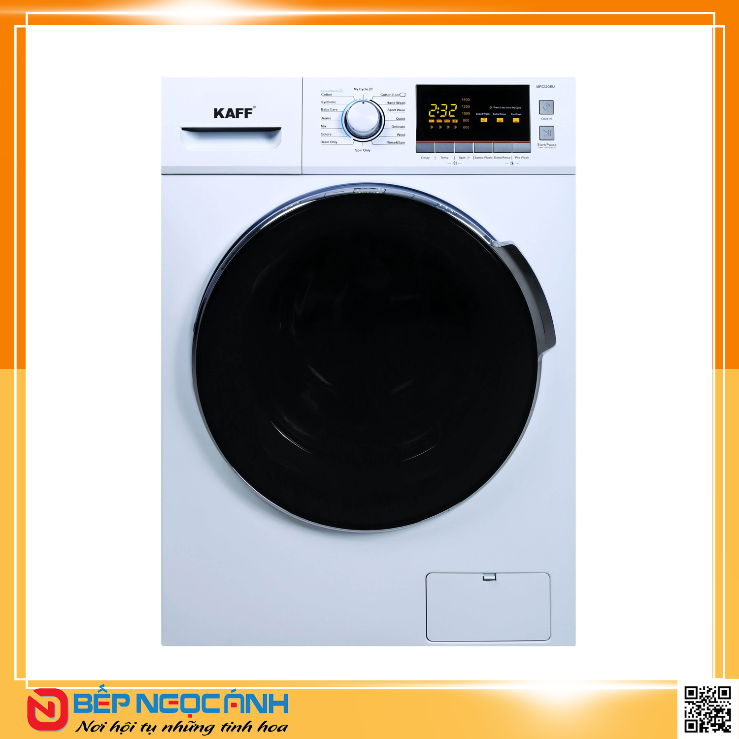 Máy giặt sấy kết hợp KAFF KF-MFC120EU cửa trước hoạt động đóng mở bằng khóa điện từ sang trọng, hạn chế sử dụng nhiều không gian nhà bạn, lồng giặt được thiết kế nằm ngang trang bị đèn phát sáng khi bạn mở cửa giúp dễ dàng quan sát, vòng đệm của máy có tác dụng chức năng kháng khuẩn và chống nấm mốc, cùng khả năng tự động làm sạch mặt trong cửa sau mỗi lần giặt. Máy giặt có 16 chương trình giặt tự động tích hợp Cotton ECO, Sport Wear, Quick, Delicate, Wool, Colors, Jeans, Spin Only, Rinse Spin, Dry Only, Mix, Baby Care, Synthetic, Cotton, 1 hour W/D, My cycle). Màn hình kiểu LED hiển thị màu cam dễ dàng quan sát.
